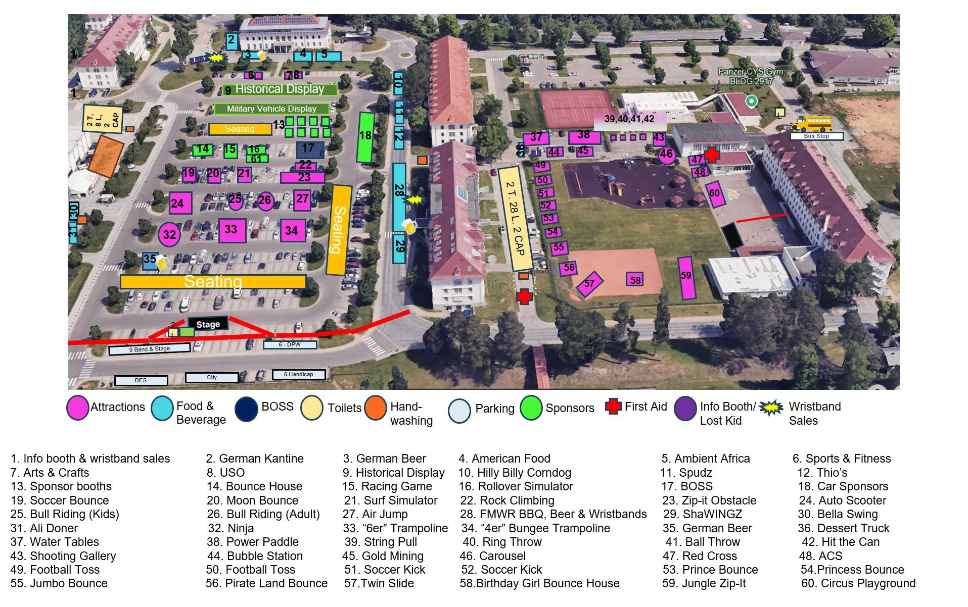 Das Festgelände gilt als außerhalb des Stützpunktes liegend. Das bedeutet, dass alle Besucher, die den für die Feierlichkeiten zum 4. Juli vorgesehenen Bereich verlassen und sich weiter auf den Stützpunkt begeben möchten, an den Sicherheitskontrollpunkten einen DOD-Ausweis vorlegen müssen.